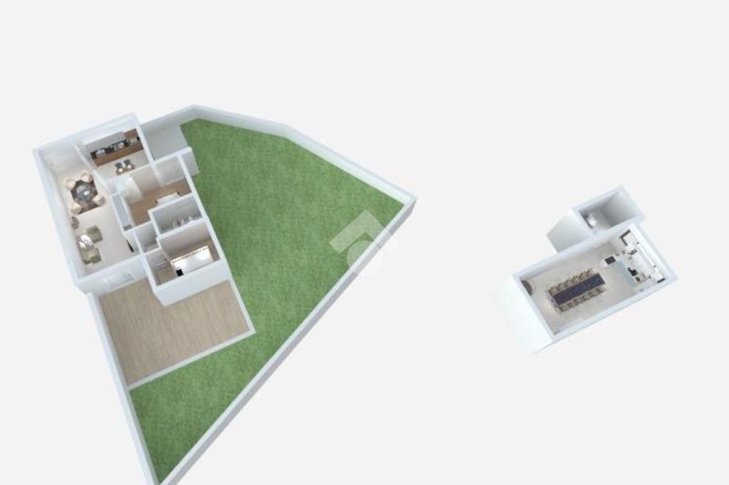 La soluzione si sviluppa: Cucina luminosa e funzionale, si apre su un terrazzino che conduce a un ampio giardino, ideale per momenti di relax all'aperto, accogliente soggiorno dal quale si può accedere a un ampio terrazzo, perfetto per cene estive o per godersi il sole. La zona notte è composta da due camere da letto, ben distribuite, e un bagno; tramite una scala interna accediamo alla taverna con bagno ed infine l'accesso diretto al box auto.