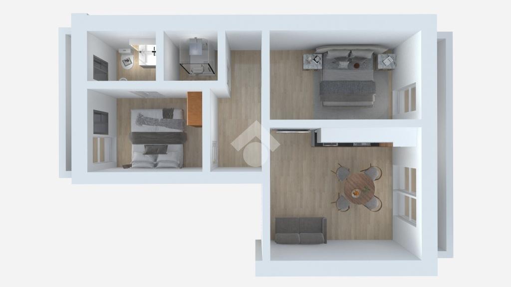 La soluzione si compone da cucina abitabile, due camere ed infine il bagno.