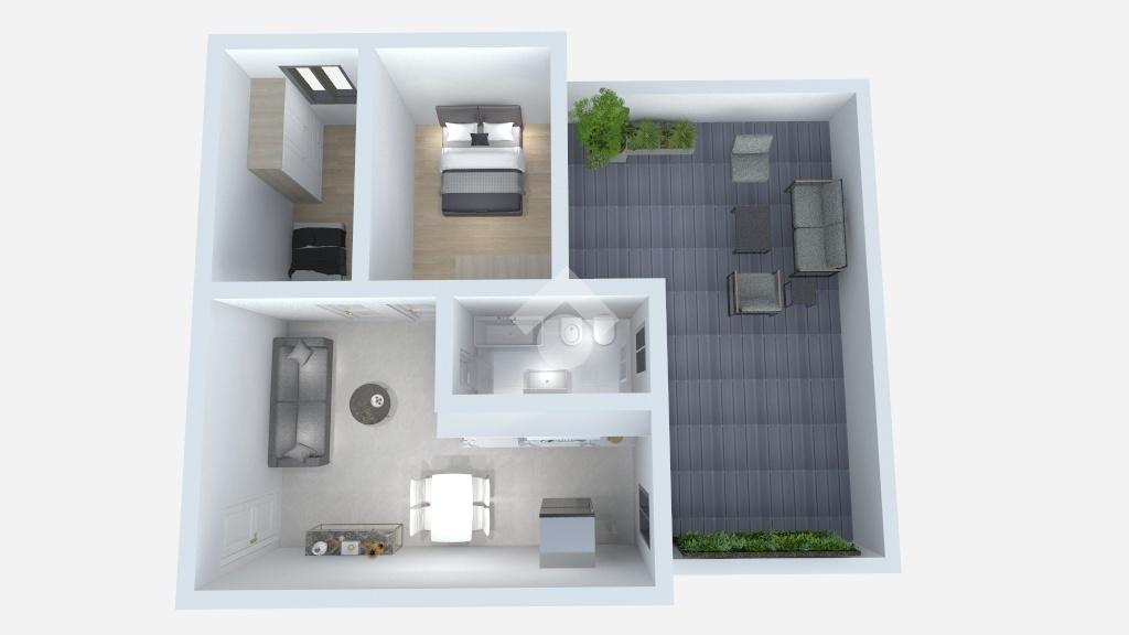 L'immobile si compone da: ingresso su zona giorno con cucina a vista, due camere da letto di cui una con accesso al giardino privato perfetto per momenti di relax, ed infine il bagno con box doccia.